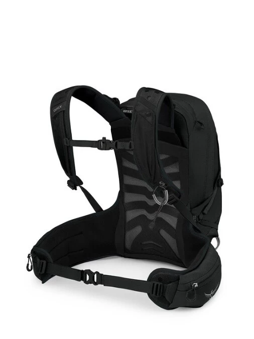 Spacermesh over die-cut foam provides breathable, comfortable contact surface Crossbody ErgoPull hipbelt system to pull lumbar into body